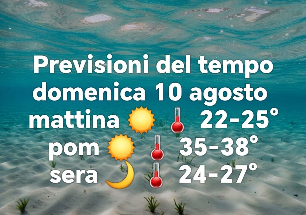 Nella giornata di domenica 10 agosto si rafforzerà ulteriormente il campo di alta pressione: cieli azzurri e limpidi al mattino, una Notte di San Lorenzo ricca di stelle e temperature in aumento fino a sfiorare i 40 gradi sul metapontino e nel foggiano. La ventilazione, sia sabato che domenica, continuerà a soffiare tra debole e moderata dai quadranti settentrionali. L’aria si riscalderà anche nelle ore serali, con valori minimi in rialzo e un clima più afoso sui paesi costieri e sul Salento.