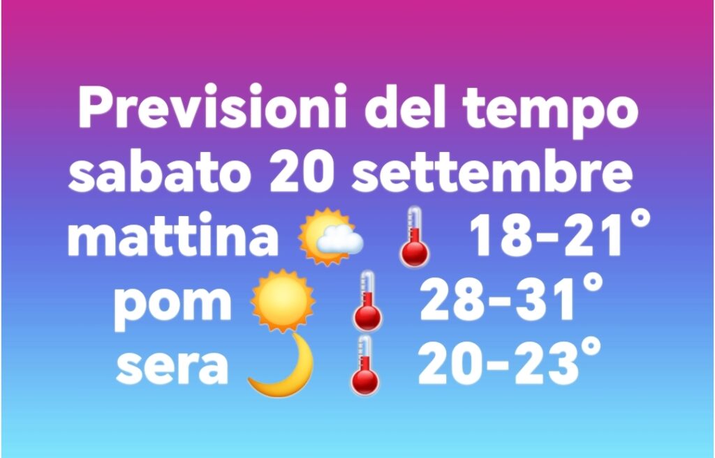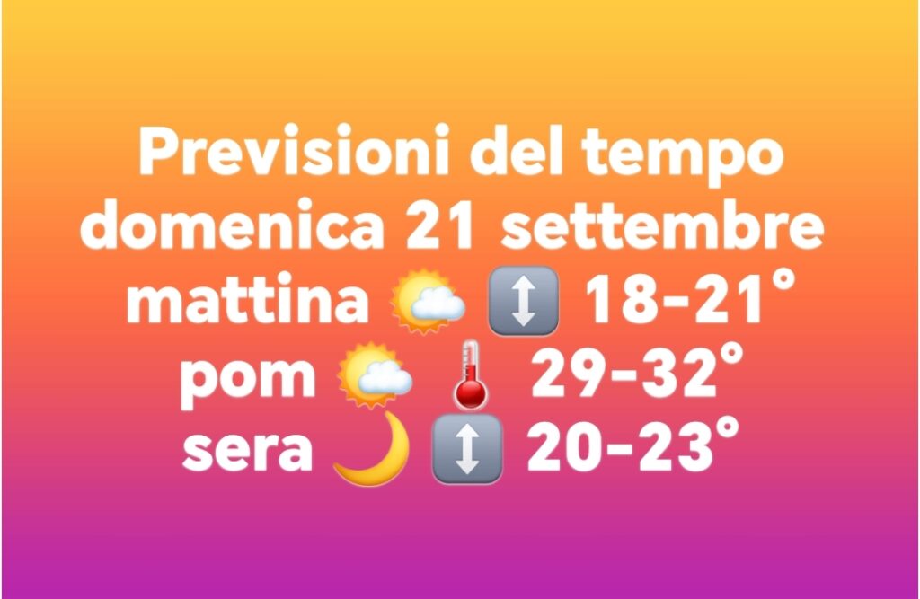 - Sabato 20 settembre: giornata ampiamente soleggiata, salvo nuvolosità innocua all’alba lungo la costa adriatica. Clima caldo e gradevole nelle ore centrali, con temperature oltre la media del periodo, fino a 30-31°C sul Tavoliere, tra metapontino e Salento. Più fresco sui settori adriatici e nelle zone interne. Venti deboli di maestrale, tendenti a ruotare da est. Mari calmi.