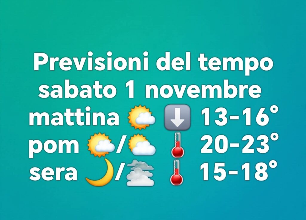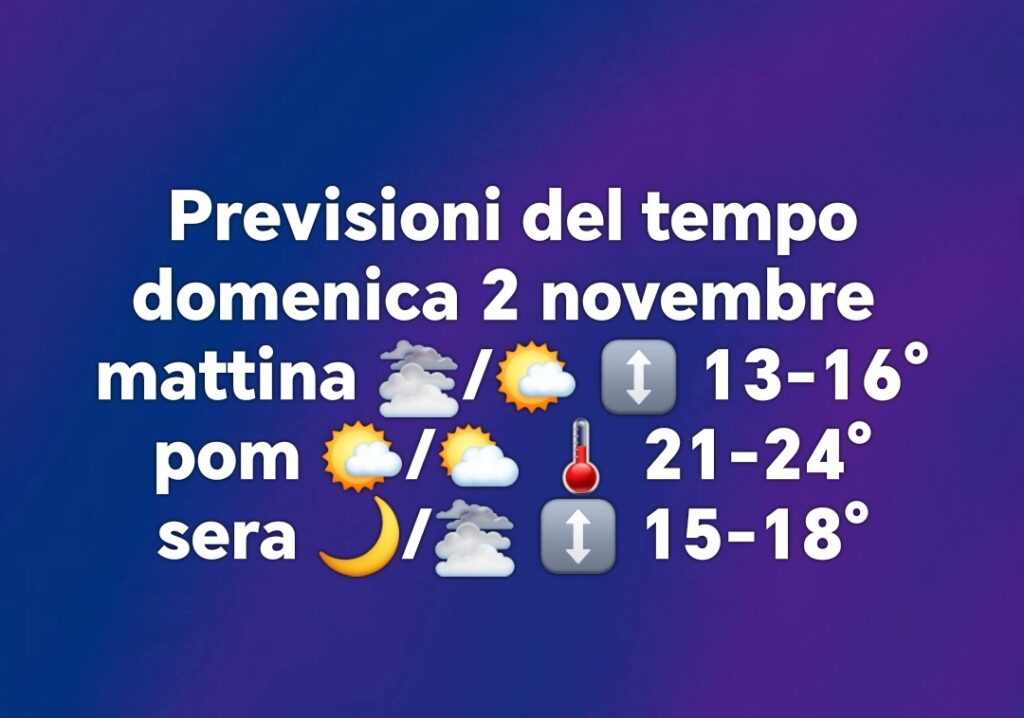 In conclusione, ci aspetta un weekend di Ognissanti all’insegna del bel tempo e del clima mite, con condizioni ideali per passeggiare all’aperto, praticare sport, raccogliere le olive o ricordare i nostri cari defunti.
