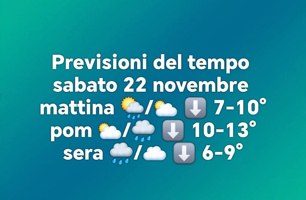 Nel dettaglio, sabato 22 novembre inizierà con cieli grigi e locali piogge sui settori centro-meridionali della Puglia e sulla Basilicata. Brevi sprazzi di sole interesseranno il Foggiano, in estensione al Barese e al Materano verso metà mattina. Nel pomeriggio persisterà una nuvolosità compatta accompagnata da piogge sparse sul Potentino, sulle aree murgiane, sul Foggiano e sul Metapontino. In serata il tempo peggiorerà sulla Valle d’Itria, sul Tarantino e sul Salento.