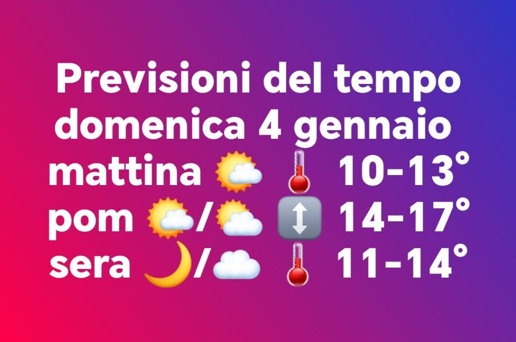 Nel dettaglio, sabato 3 gennaio trascorrerà con cieli parzialmente nuvolosi su Puglia e Basilicata orientale, mentre sul potentino si osserverà una nuvolosità più compatta ma senza fenomeni. Il clima risulterà mite: nelle ore centrali si potranno raggiungere punte di 17–18°C sull’hinterland barese, sulla costa barlettana, sul Tavoliere e localmente sul Salento. Anche in serata le temperature si manterranno su valori autunnali, con 9–11°C nelle aree interne e 12–14°C su pianure e litorali.