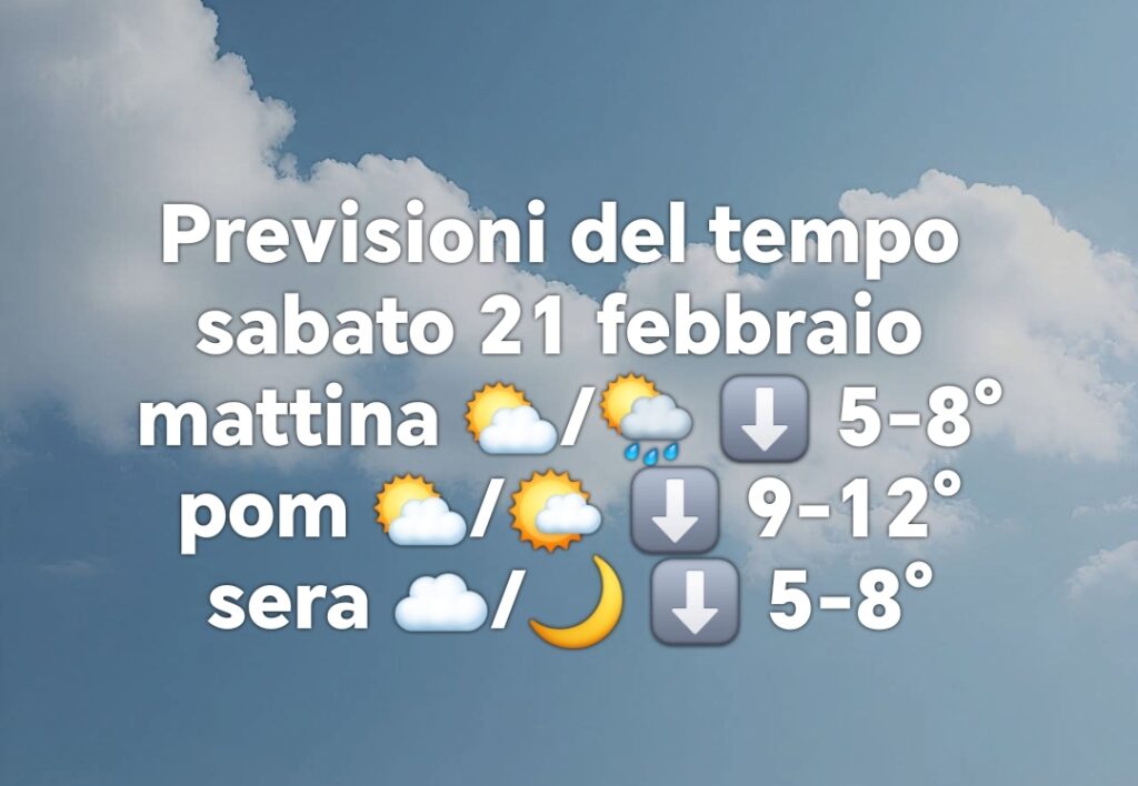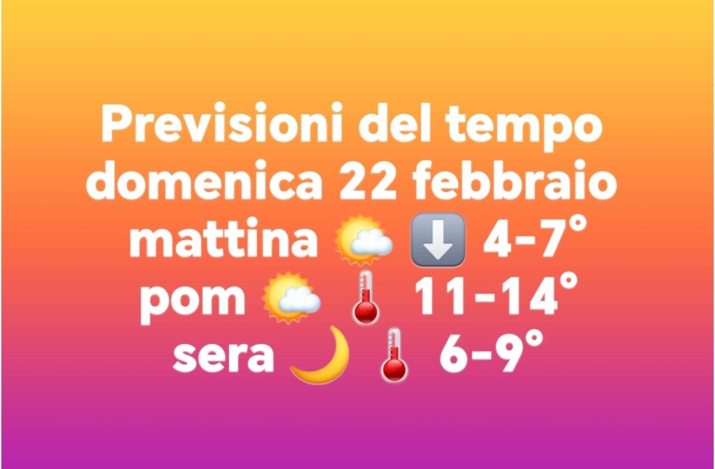 Domenica 22 febbraio la perturbazione si sarà definitivamente spostata verso la Grecia, determinando condizioni di bel tempo. Dopo una prima mattinata piuttosto frizzante, il sole di fine febbraio riscalderà l’aria fino a regalare un gradevole tepore, con temperature di 11-14°C nelle ore centrali. Il vento, inizialmente sostenuto da nord, tenderà ad attenuarsi in serata.